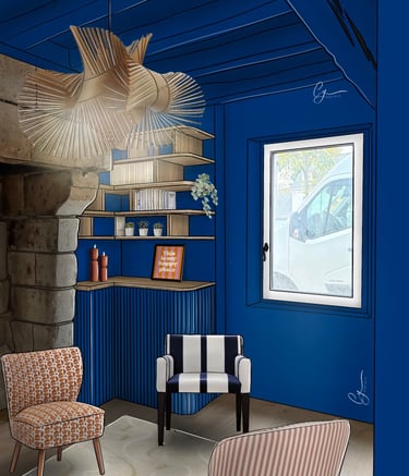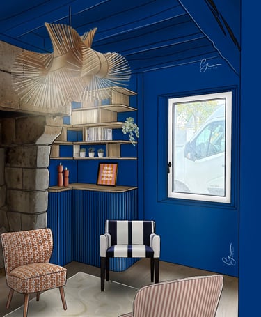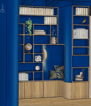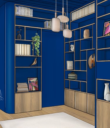 Cette pièce déjà peinte en bleu majorette n'attendais qu'une bibliothèque pour devenir un lieu cosy, propice à la détente. J'ai choisi d'inclure des formes arrondies pour apporter de la douceur à l'agencement.