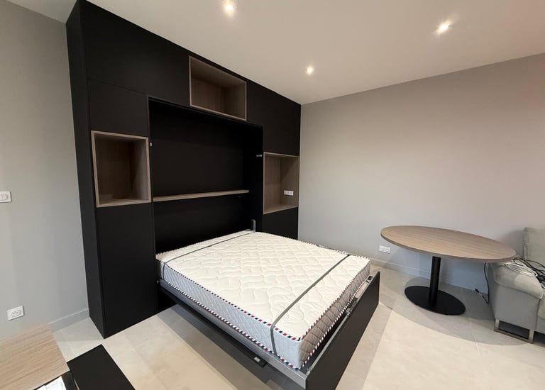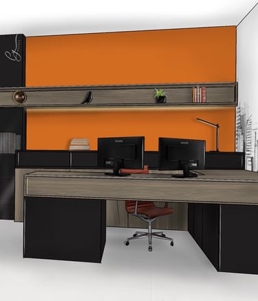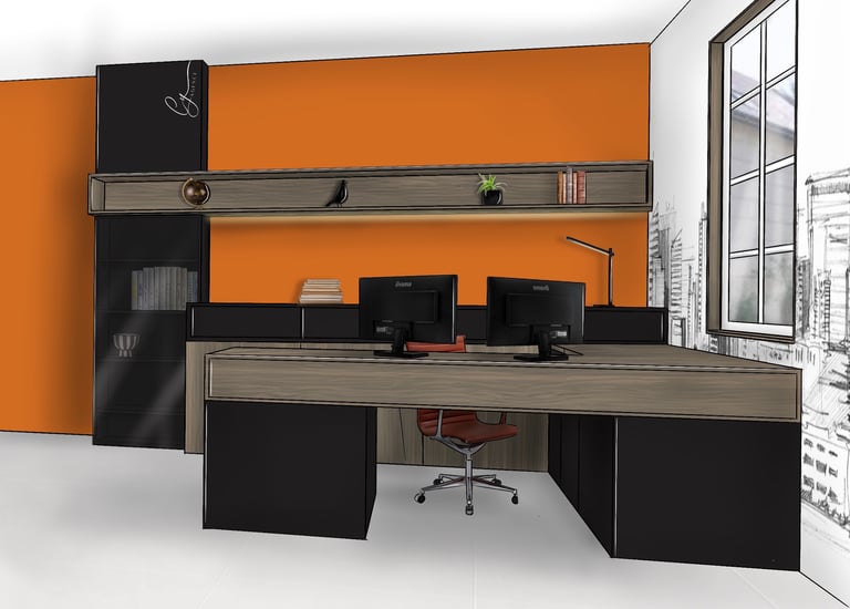 Création d'un espace de travail dans les tons ocres, incluant des rangements.